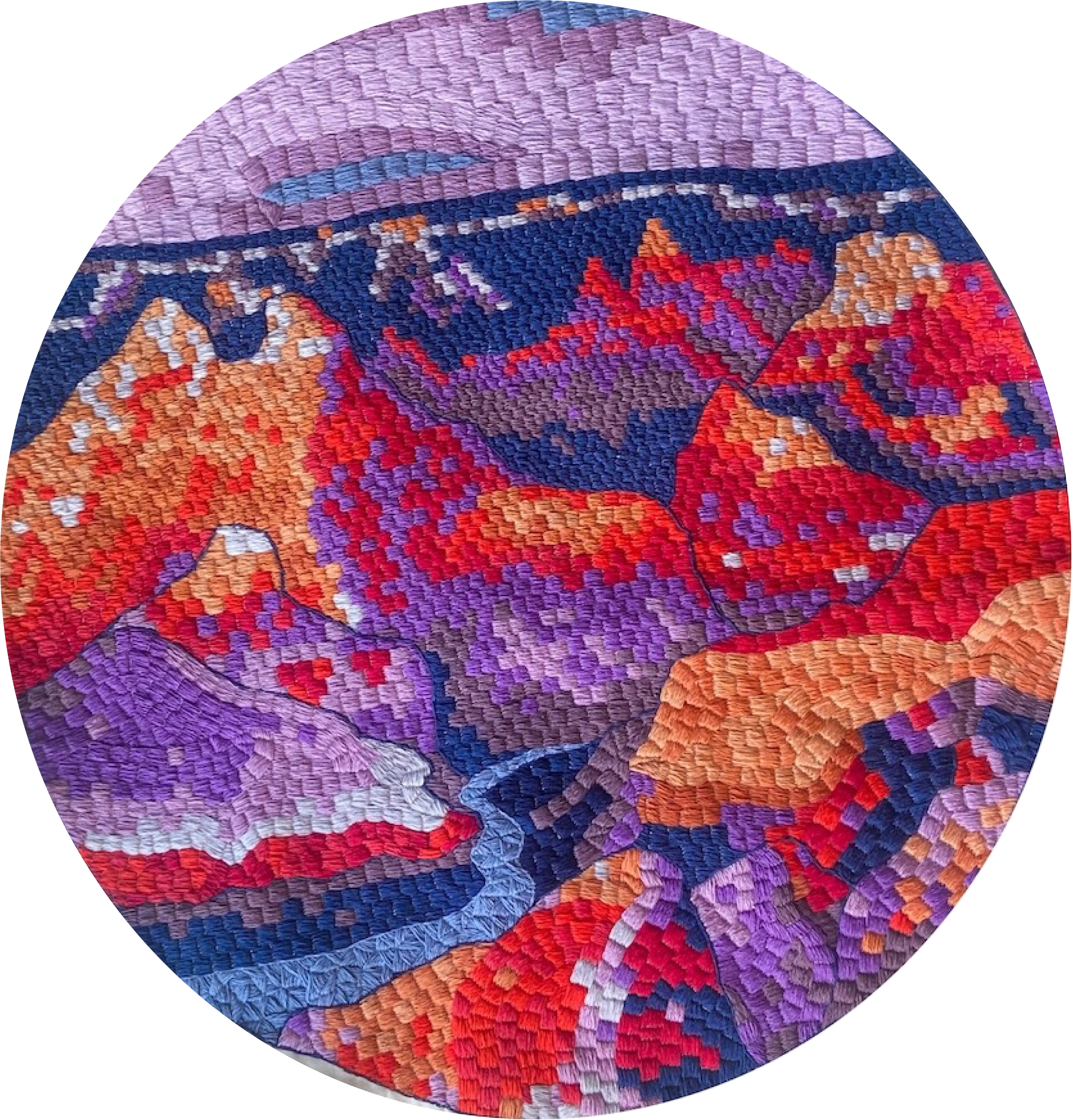 Hand embroidery on cotton, 8” diameter